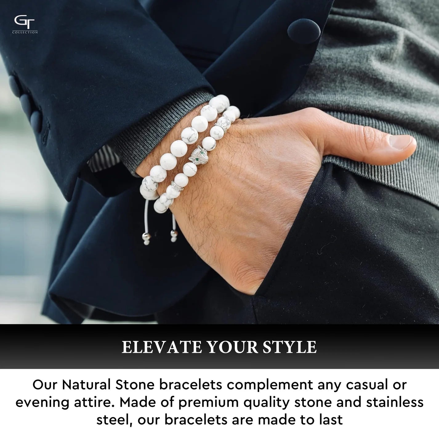 Leopard simbolizira moč, odločnost in neodvisnost. V kombinaciji z naravnim kamnom howlit, ki spodbuja sprostitev in čustveno ravnovesje, ta zapestnica predstavlja popolno ravnotežje med zunanjo močjo in notranjim mirom. Idealna je za sodobnega moškega, ki ceni eleganco in energijsko podporo naravnih kamnov.