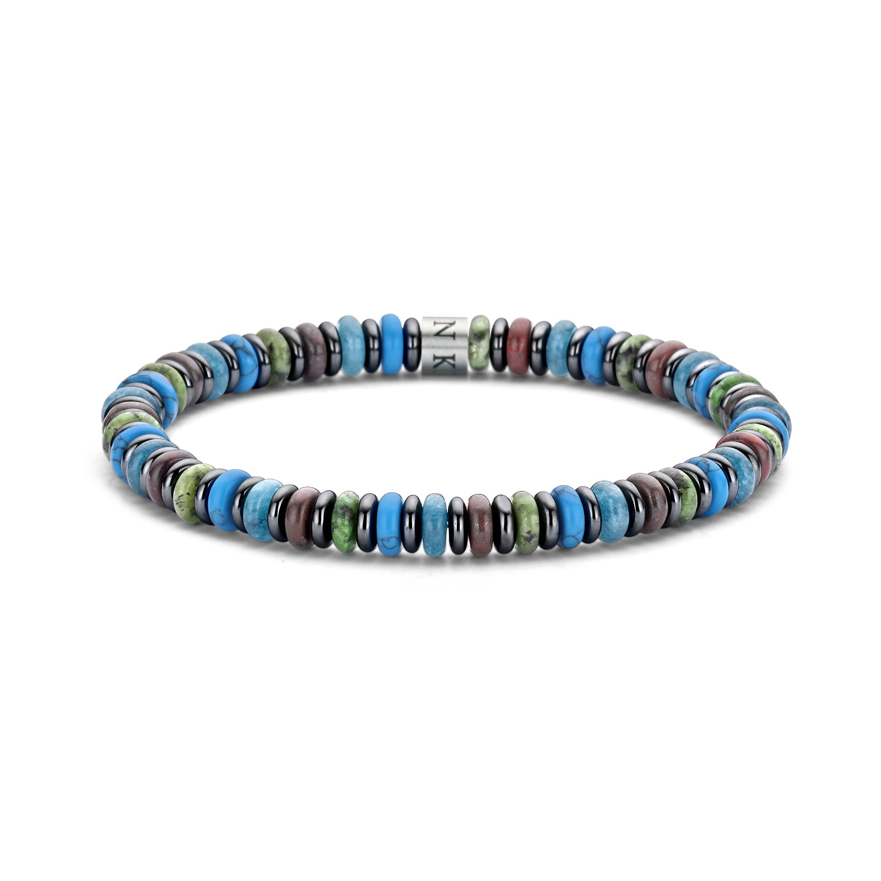 Moderna zapestnica iz naravnih kamnov (turkiz, modri žad, rdeči jaspis) s perlami velikosti 6x2 mm. Dolžina 20 cm in jekleni detajli poskrbijo za eleganten videz. Odličen modni dodatek, ki ga lahko kombinirate z drugimi čudovitimi kosi Frank 1967.