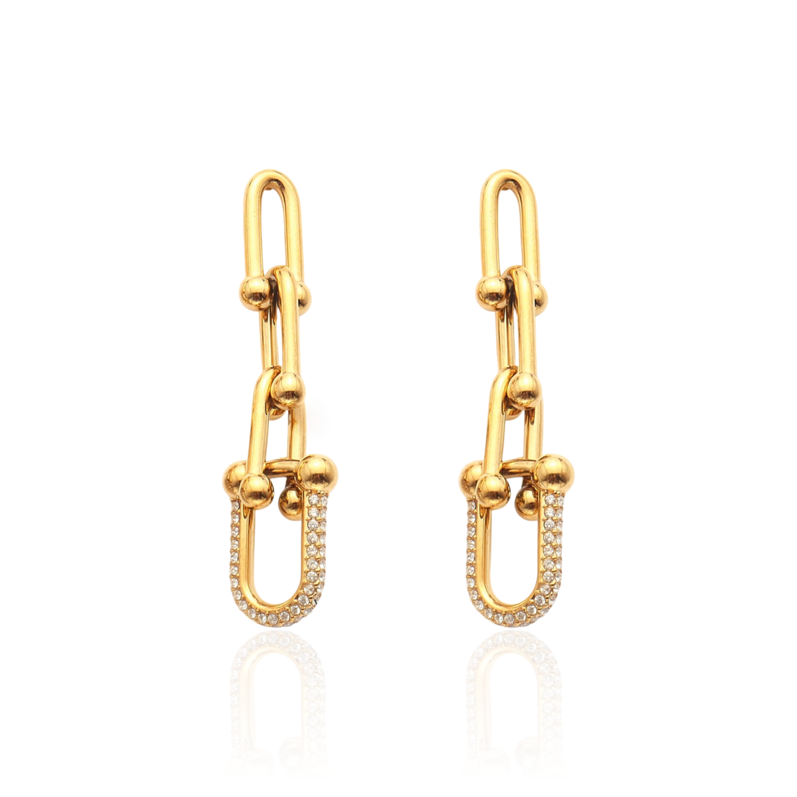 Sodobni viseči uhani iz nerjavečega jekla v zlati barvi, oblikovani z elegantnimi členki in drobnimi kristalnimi detajli. Trendovski dizajn, ki združuje minimalistično eleganco in subtilen sijaj – popolni za vsakdan in posebne priložnosti.
