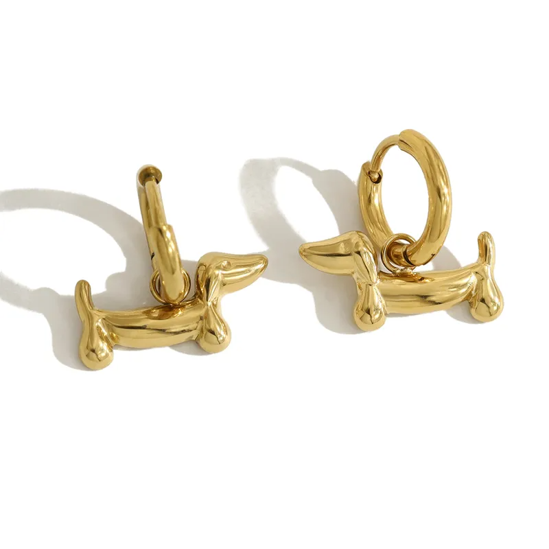 Uhani iz nerjavečega jekla v zlati barvi z majhnim obročem in obeskom v obliki psa. Premer obroča približno 1 cm, širina obeska okoli 1,5 cm. Igriv modni kos za vsakdan.