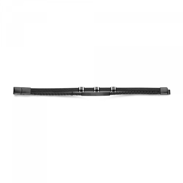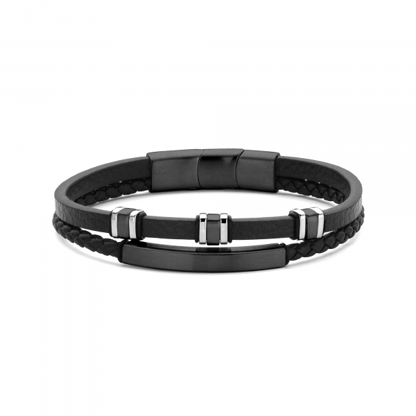 Sodobna dvojna zapestnica iz mehkega črnega usnja z elegantnimi črnimi jeklenimi detajli. Dvojno ovijanje doda globino in značaj, močna zaponka pa zagotavlja varno in udobno nošenje.