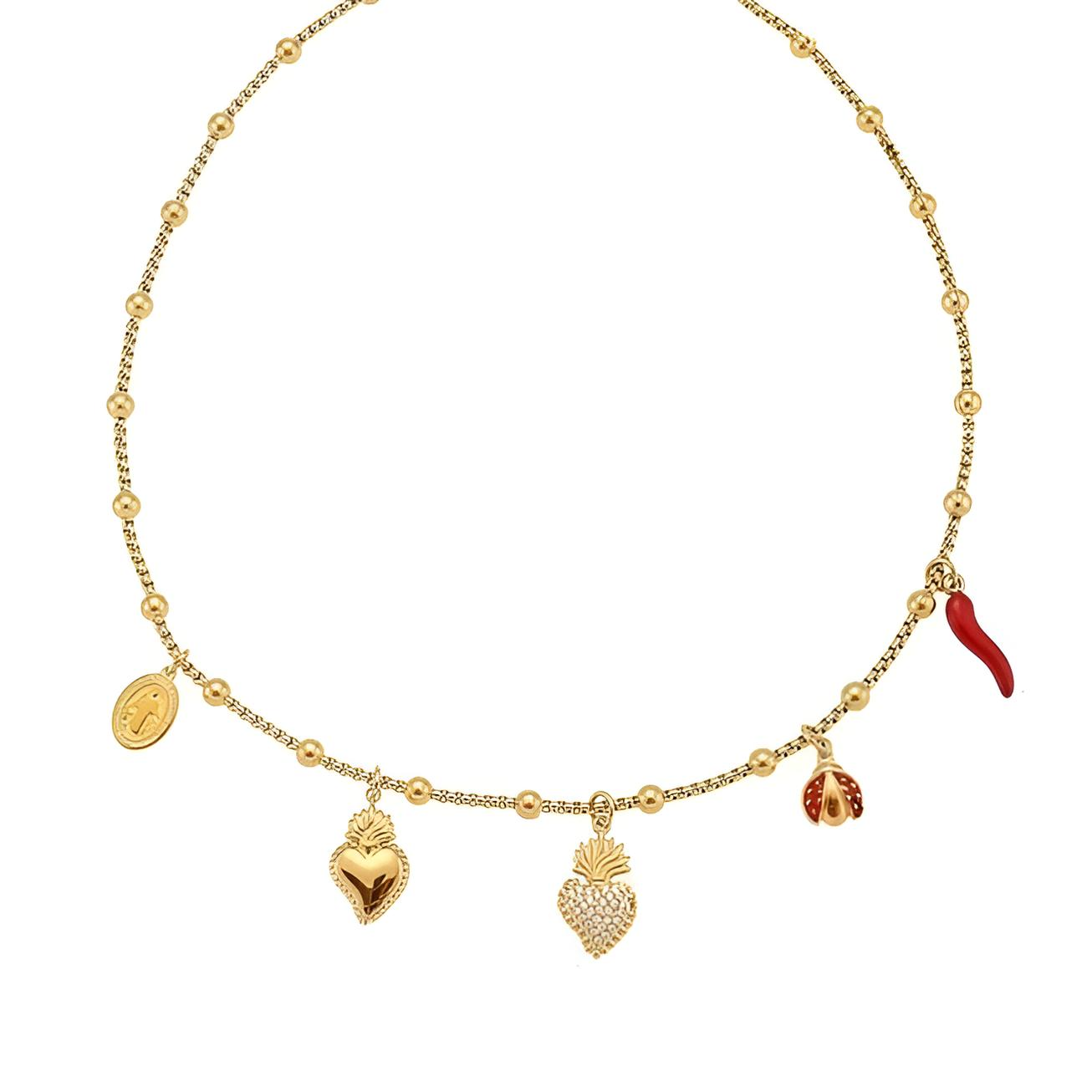 Pozlačena verižica z obeski za srečo – srček, pikapolonica, medaljon in rdeč čili. Dolžina 40 + 5 cm. Izdelana iz nerjavečega jekla, ki ohranja sijaj in trajnost. Igriv, moderen kos, ki prinaša čarobno energijo in popolno dopolni vsak videz.