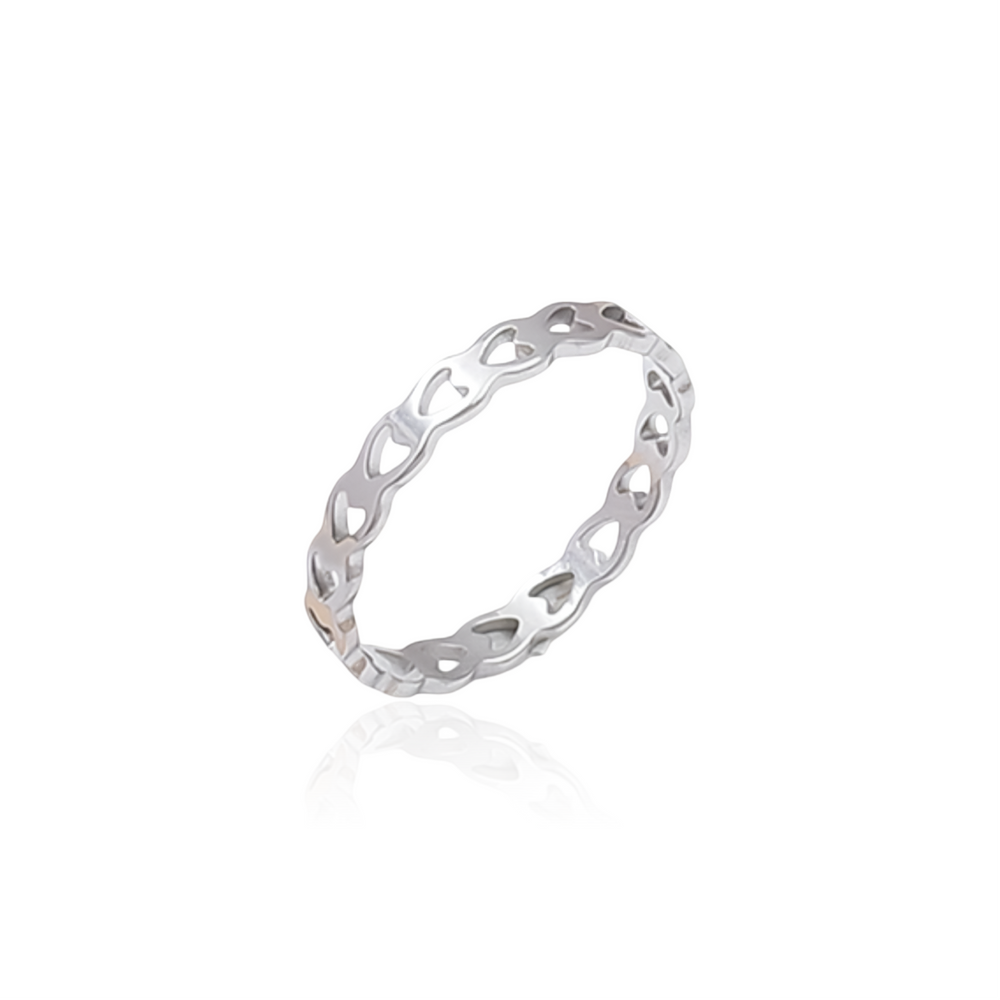 Elegantni prstan iz nerjavečega jekla, širok 3 mm, na voljo v zlati in srebrni barvi. Nežen izrezan vzorec mu daje prefinjen videz, primeren za vsakodnevno nošenje ali kombiniranje z drugimi prstani. Material je trpežen, ne potemni in je prijazen do kože.