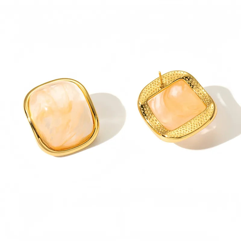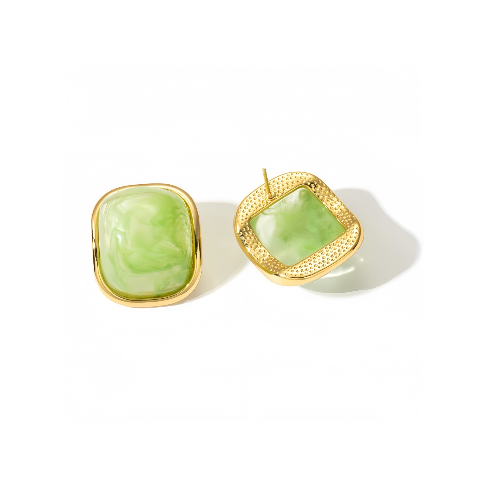 Elegantni uhani iz nerjavečega jekla s kvadratnim dizajnom in sijočim kamnom v barvi perle ali jadeja. Zlati rob z rahlo teksturo daje uhanom prefinjen videz, ki se lepo poda tako k dnevnim kot večernim outfitom. S premerom približno 2,5 cm so popolna izbira za subtilen, a opazen modni detajl.