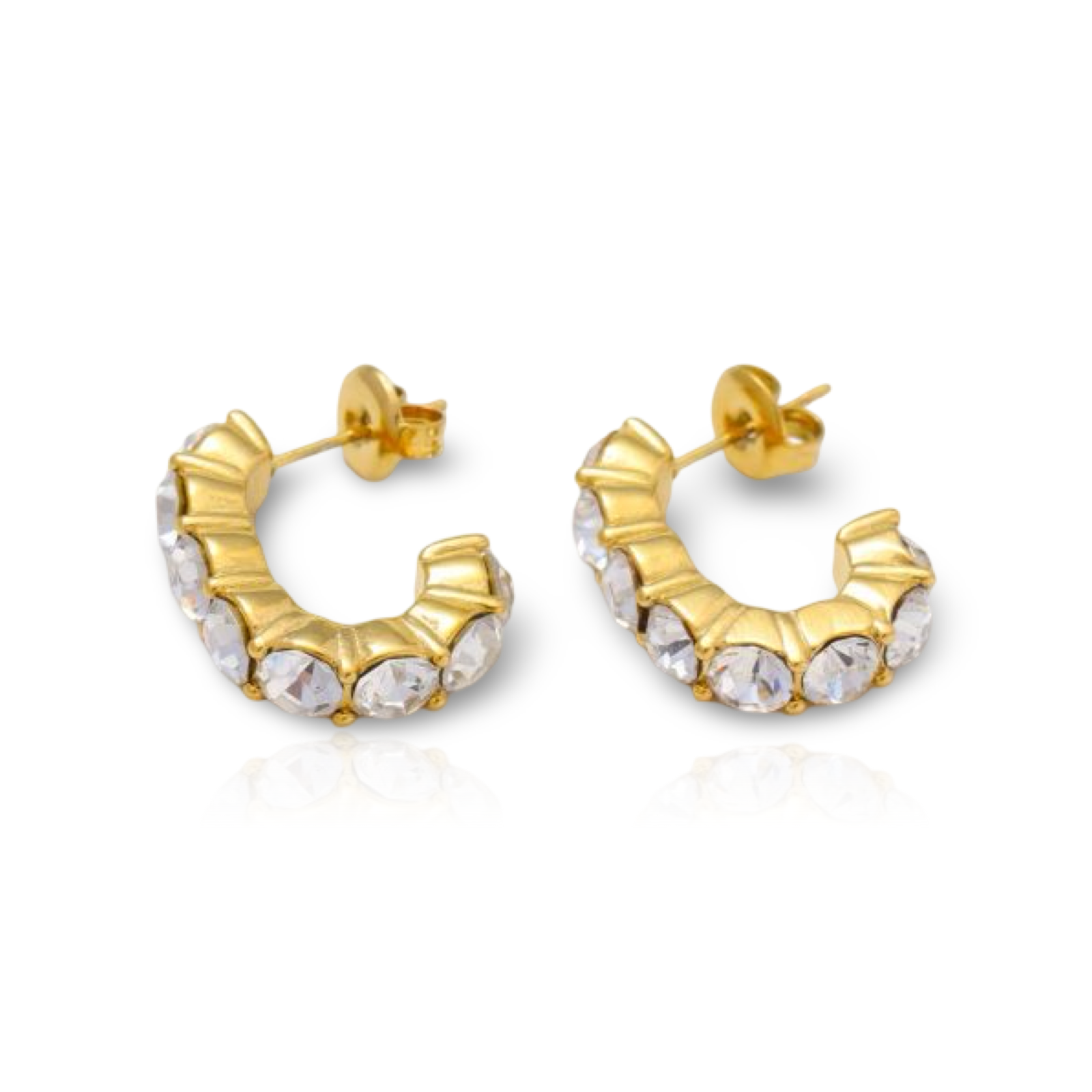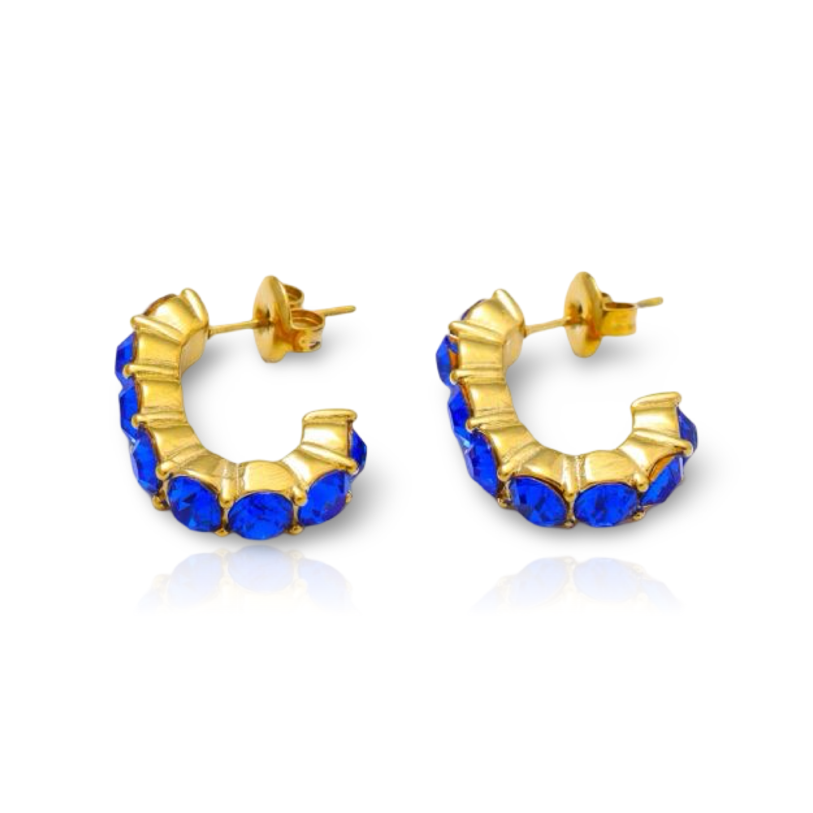 Trendi uhani iz nerjavečega jekla v obliki obroča (premer cca 2 cm) s poudarjenimi bleščečimi kristali. Zlata osnova poudari barvo kristalov, ki so na voljo v štirih različicah – prozorni, kraljevsko modri, rubinasto rožnati in črni. Popolni za sodoben videz z dotikom glamurja – primerni tako za vsak dan kot večer.
